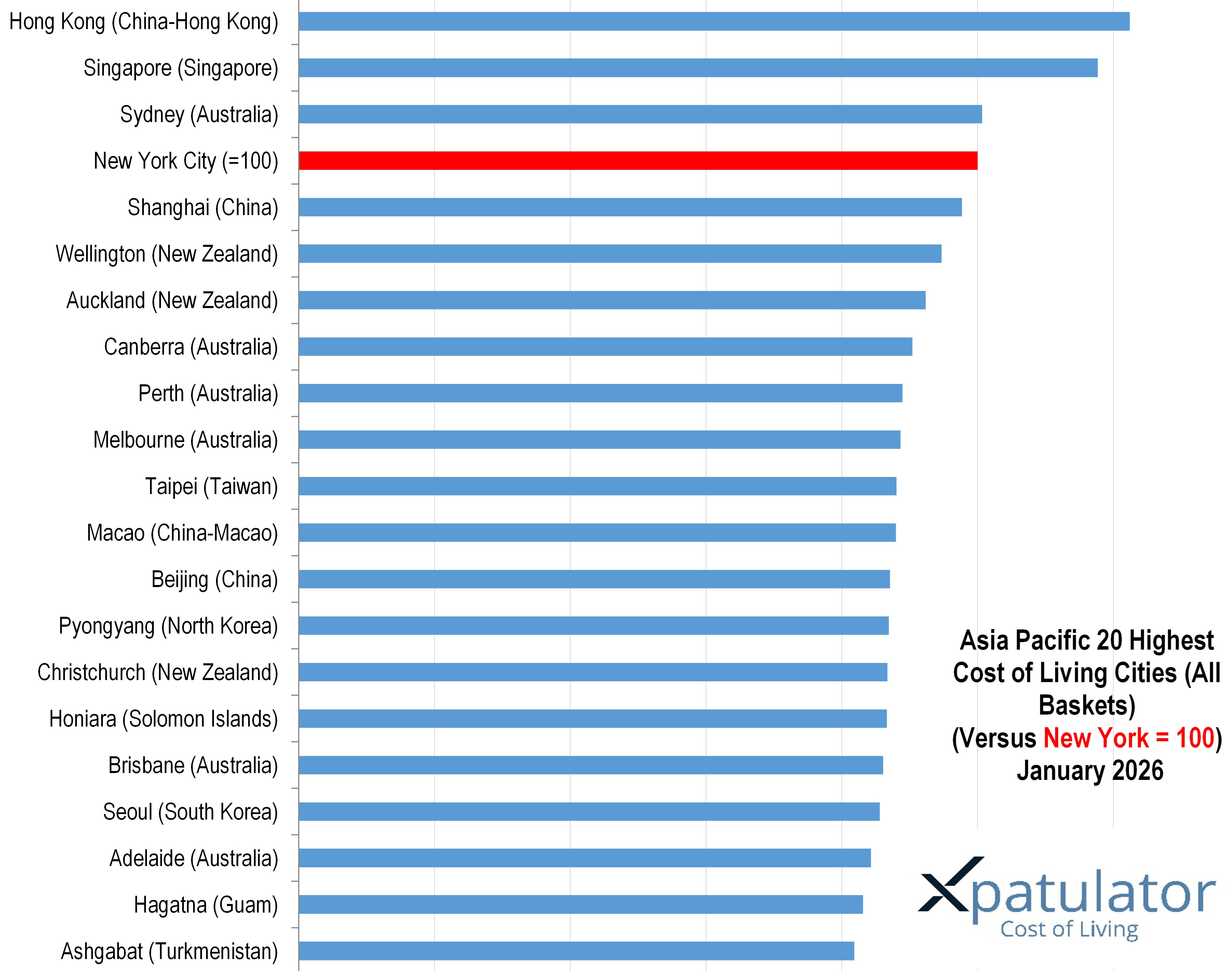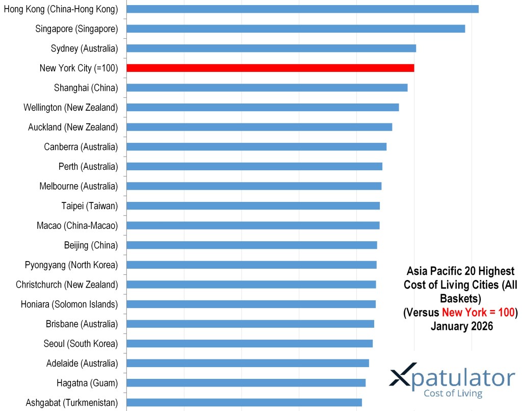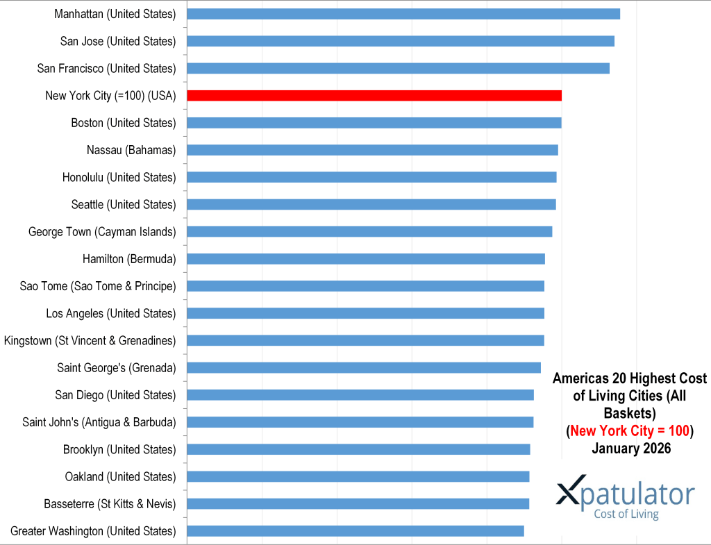 Xpatulator’s 2026 international city rankings highlight a simple pattern. The most expensive locations for international professionals tend to be compact, high income markets with constrained housing supply, expensive services, and currencies that hold value in United States dollar terms. New York City is set to 100 as a reference point. The top twenty then spans Western Europe, parts of Asia, and coastal United States markets, with a smaller set of high cost island hubs.