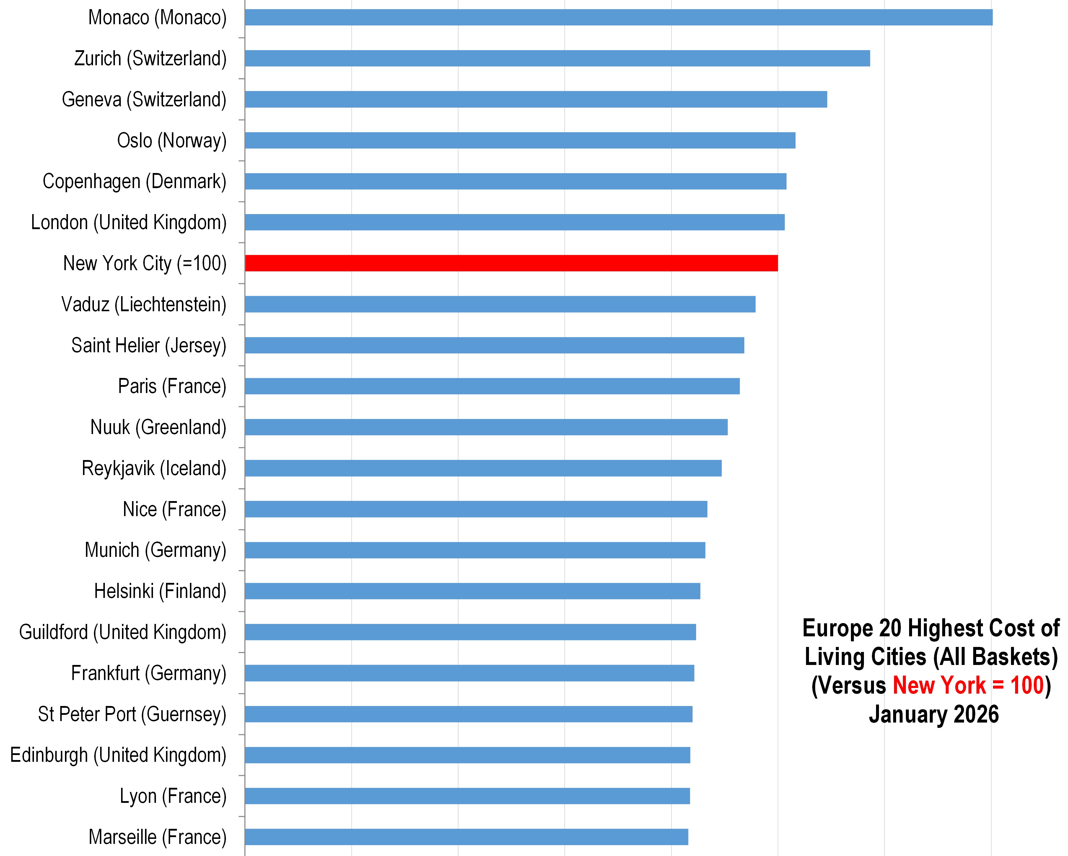 Monaco leads at 140.3 because residential supply is structurally limited and demand is persistently global. Housing costs typically dominate expatriate budgets, with private services following, because staffing and space are priced at a premium. Switzerland follows with Zurich at 117.3 and Geneva at 109.2, where high wages and high service costs translate into elevated everyday pricing for the consumption baskets typical of internationally mobile households. The Swiss inflation backdrop has been relatively subdued, with the Swiss National Bank signalling inflation remains within its target range, yet the Swiss franc’s safe haven characteristics often keep United States dollar converted costs high.