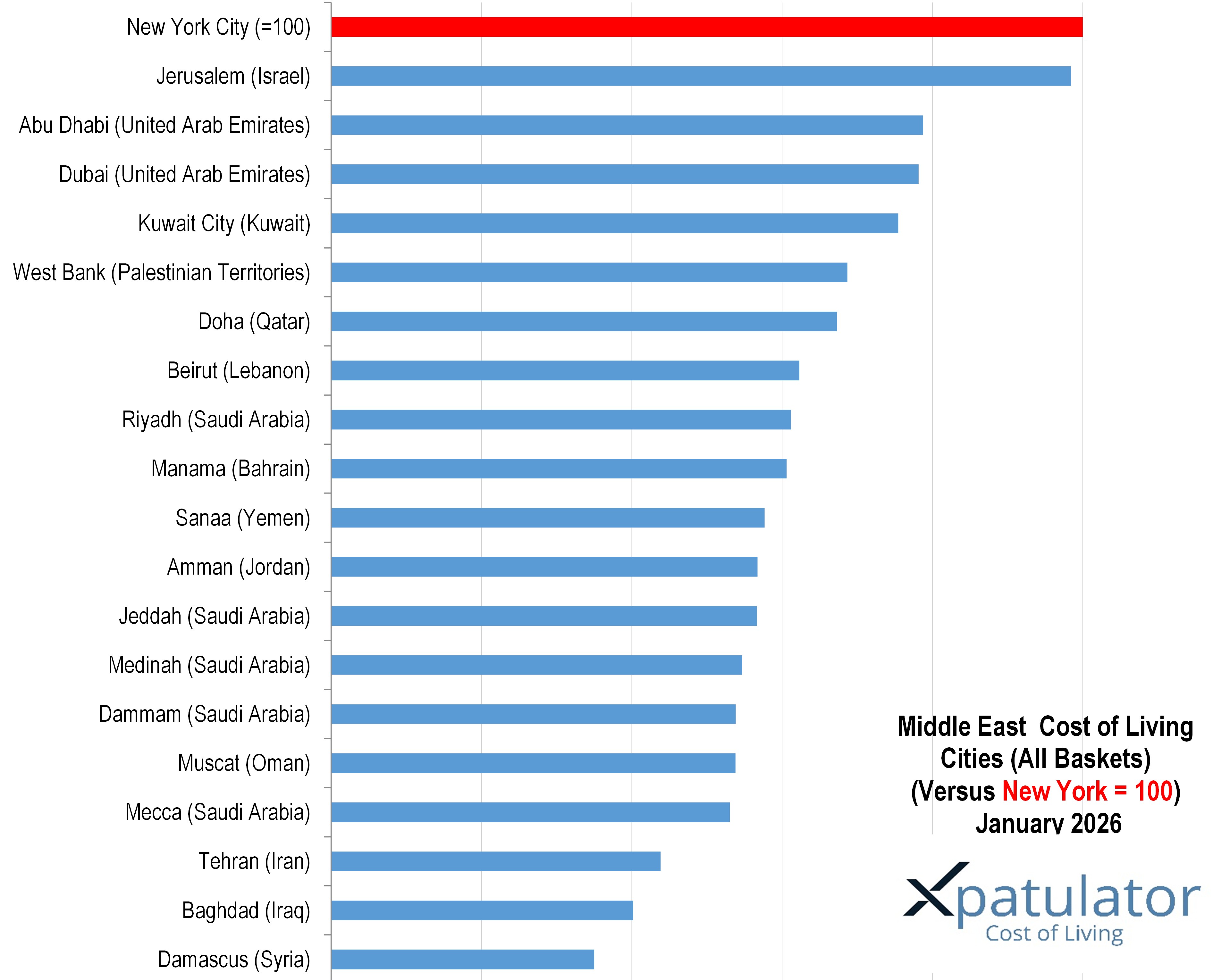 Current affairs and security conditions can also influence expatriate costs, particularly through insurance, security, and logistics. Jerusalem at 98.4 is the highest ranked city in the Middle East list, and it sits close to New York City in the global benchmark, while operating in a region affected by ongoing conflict and periodic instability. The Israeli shekel has also strengthened, which can raise United States dollar converted living costs for expatriates paid in dollars. More broadly, shipping disruption and higher war risk insurance can feed into import costs across multiple regions, which is especially relevant for island markets and smaller import dependent economies.