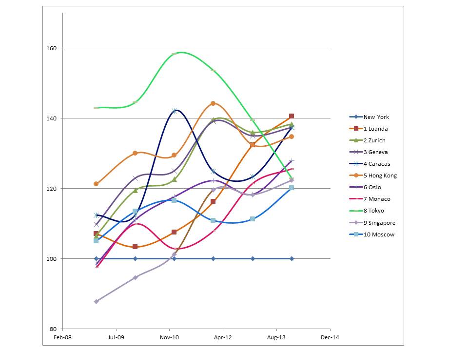 4. Caracas shows upward movement back to its high COLI in 2011 of 142.1, from 112.39 in 2009 to 137.4 in 2014, this is due to the high inflation and rentals, however there is again pressure on the currency to be devalued which should temporarily bring costs down in the short term.