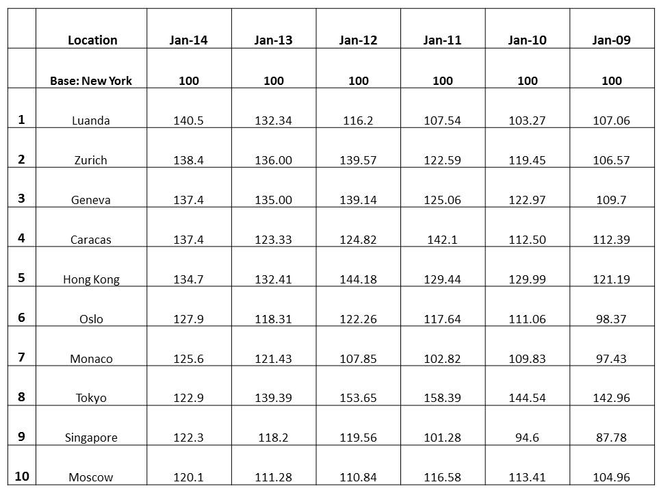 2. Luanda in Angola has moved from an index of 107.06 in 2009 to a 140.4 in 2014 making it the most expensive destination for expats in Africa and the world. This change is mainly due to supply and demand of expat accommodation which is costly. A rented house in a guarded community can cost between US$8 000 and US$12 000 per month, other costs for schooling, groceries and entertainment are also costly.