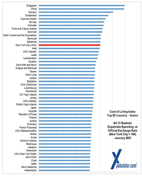 World’s most expensive places in April 2021. Cost of living indexes (New York = 100) :