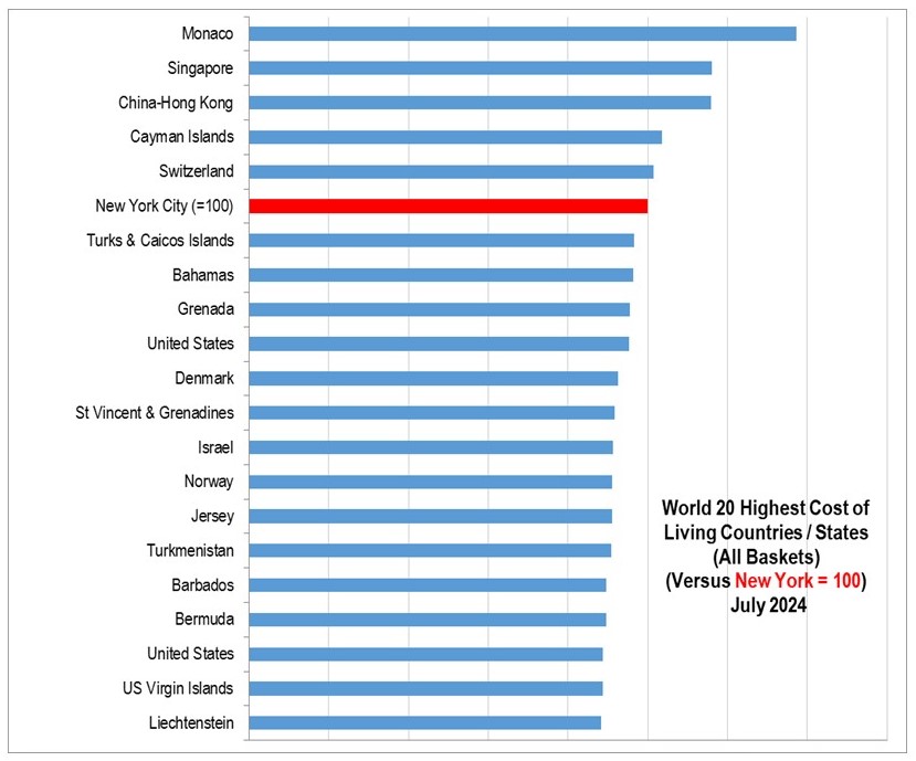 Monaco retains its position as the most expensive place globally to live in, with a Cost of Living Index (COLI) of 137.4. Monaco is a magnet for the wealthy, offering tight security, tax breaks, and a dash of luxury, at the cost of the tight squeeze of available space. This mix shoots property prices through the roof, making Monaco 21.3 points pricier than its closest competitor, Singapore.