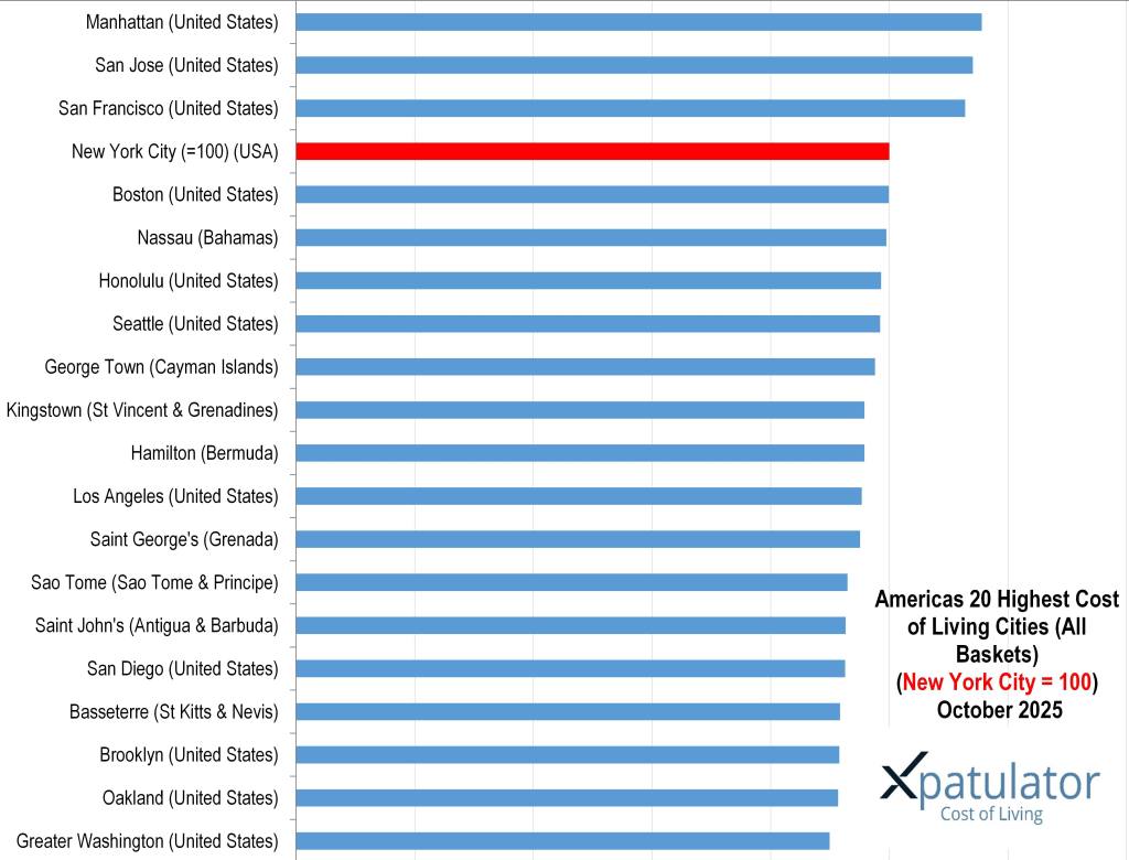 Manhattan 115.6, San Jose 114.1, San Francisco 112.8 outpace New York (100) — that’s elite-level cost.