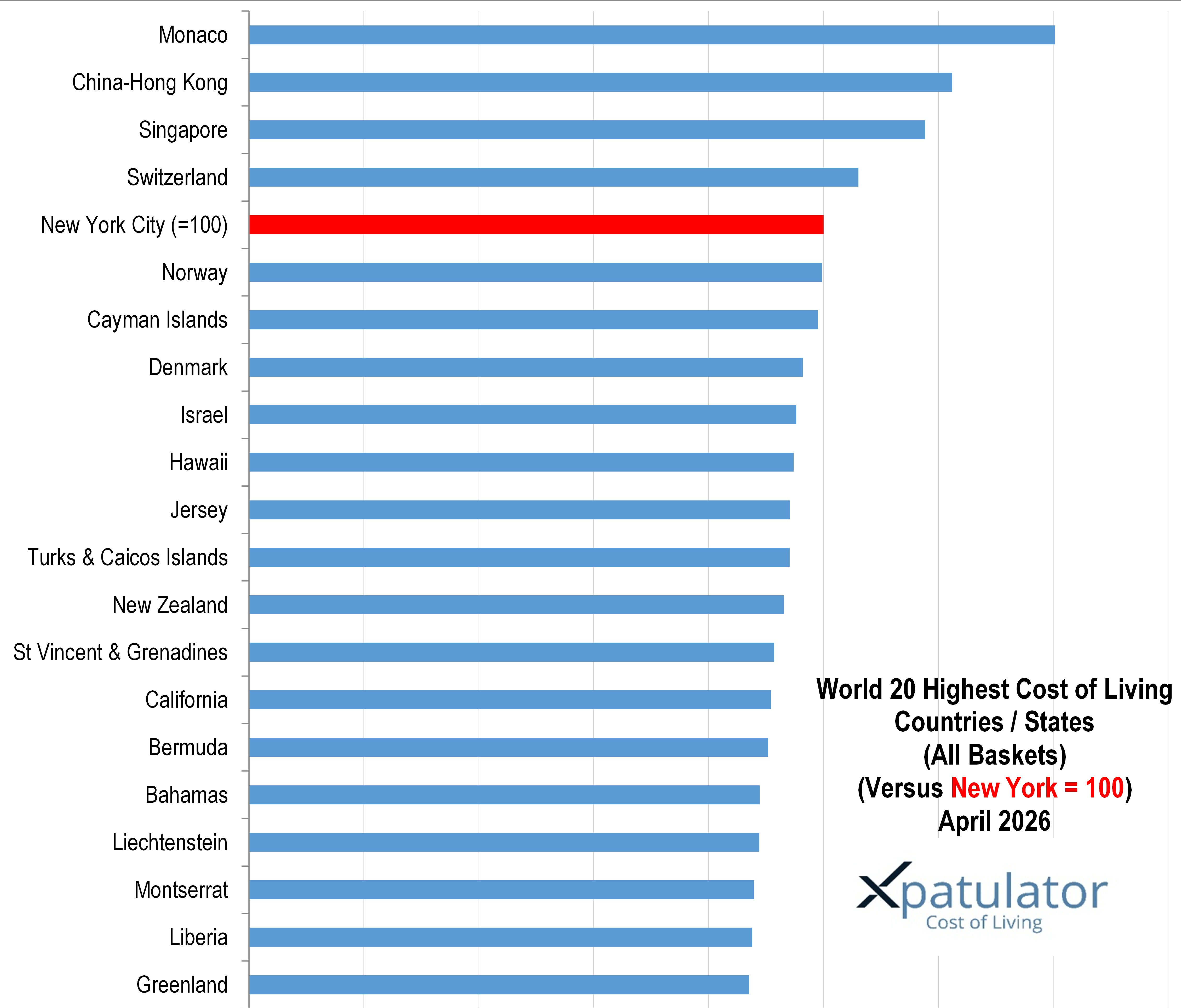 The latest country and state rankings show how expensive everyday life can become for international professionals once housing, services, and imported consumption are priced in. New York City is set to 100 for comparison, so each index indicates the relative cost of a comparable expatriate basket. The top tier is led by Monaco at 140.3, followed by Hong Kong, China at 122.4 and Singapore at 117.7, with Switzerland at 106.1. A second cluster sits around the New York City benchmark, including Norway at 99.7 and the Cayman Islands at 99.0. A third group falls into the low to mid nineties, dominated by islands and smaller jurisdictions where import dependence and limited housing supply keep prices firm.