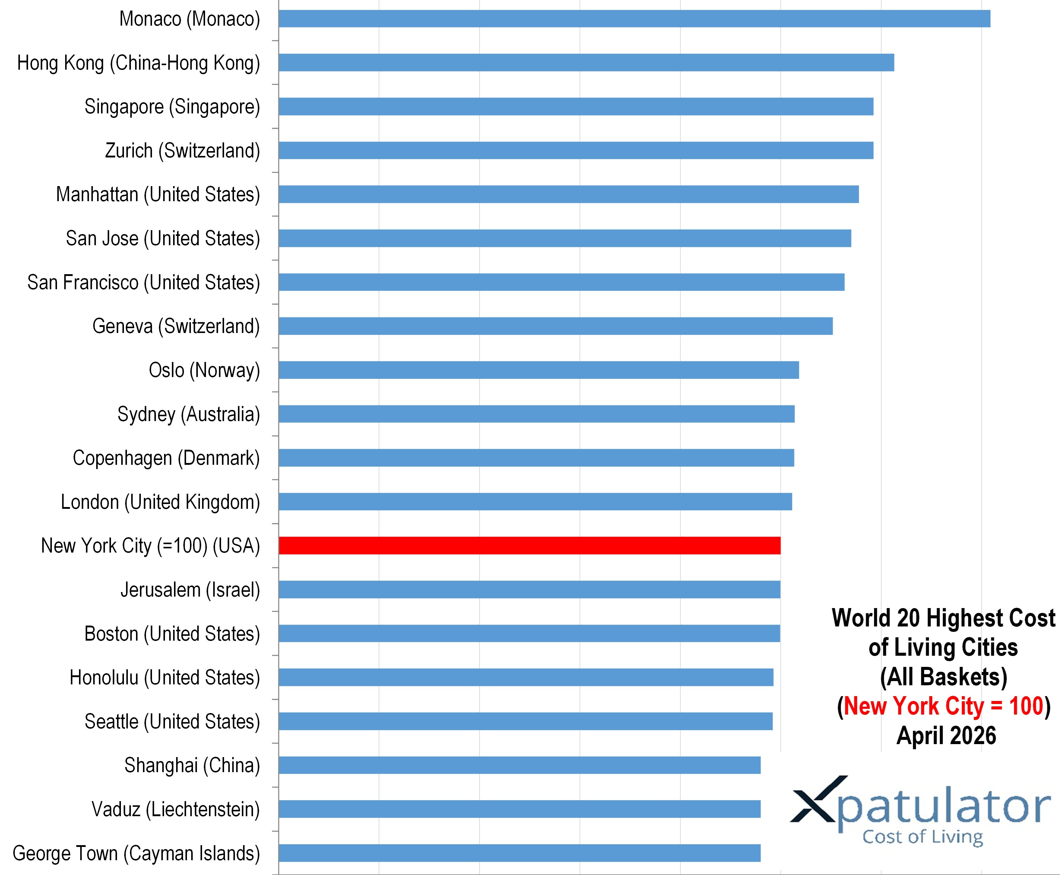 The global distribution of high cost cities in 2026 reflects a combination of economic structure and market constraints. Xpatulator’s latest rankings, benchmarked against New York City at 100, show that the most expensive locations are not randomly distributed. They are concentrated in markets where housing is scarce, services are labour intensive, and demand is supported by internationally mobile professionals.